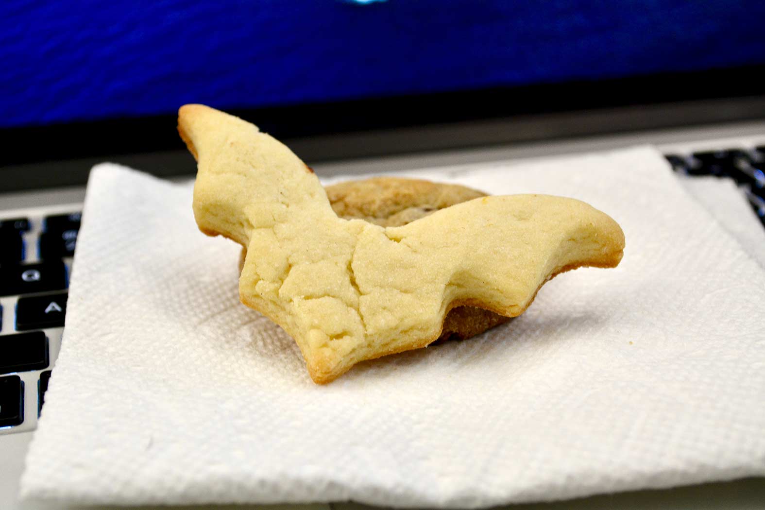 October 9, 2019 - Wednesday - My friend's little girl made cookies last night. He brought in a bunch for the office. I picked out a bat and chocolate chip for a mid-morning snack. I used the bat as a mustache for a photo shoot!