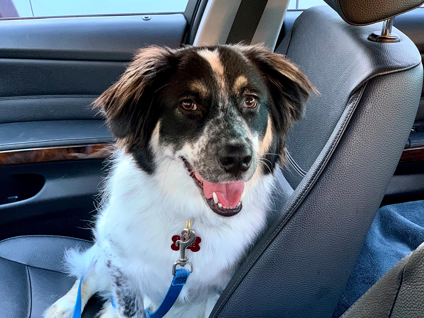 October 26, 2019 - Saturday - This weekend I'm dog/housing this one again. Today we got out for a little while to pick up dinner. I put her in the back with a blanket to cover the seat. When I came back with the goods she was sitting here. I think she likes the front seat a little bit better.
