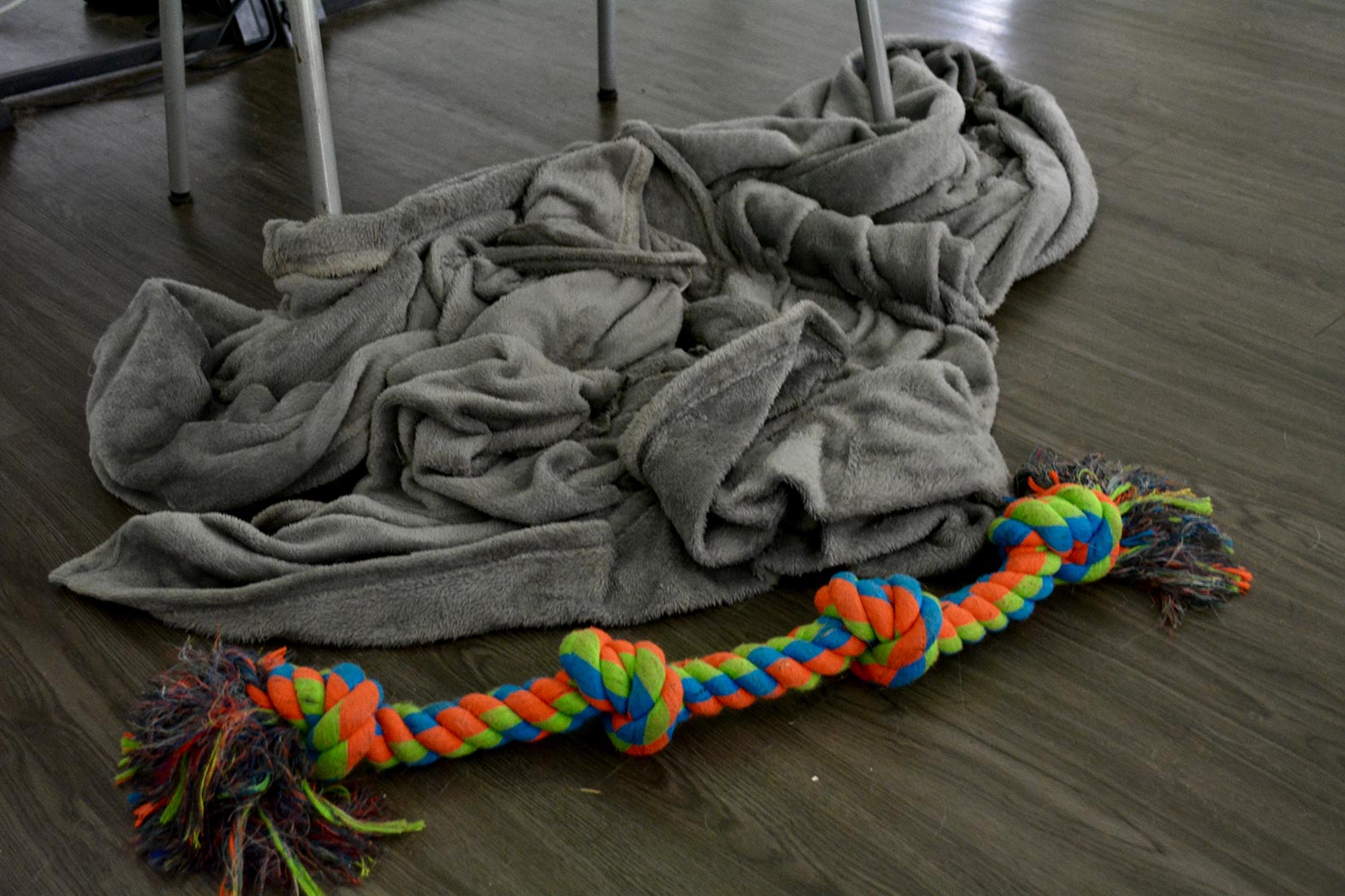 April 6, 2020 - Monday - Today while we were doing our Zoom conference call with the peeps from work Zak was upset that I was talking and not talking to him. He pulled his blanket off his kennel and started throwing it around. Then he started throwing is rope around. He eventually put it all behind my chair and laid there while I worked.