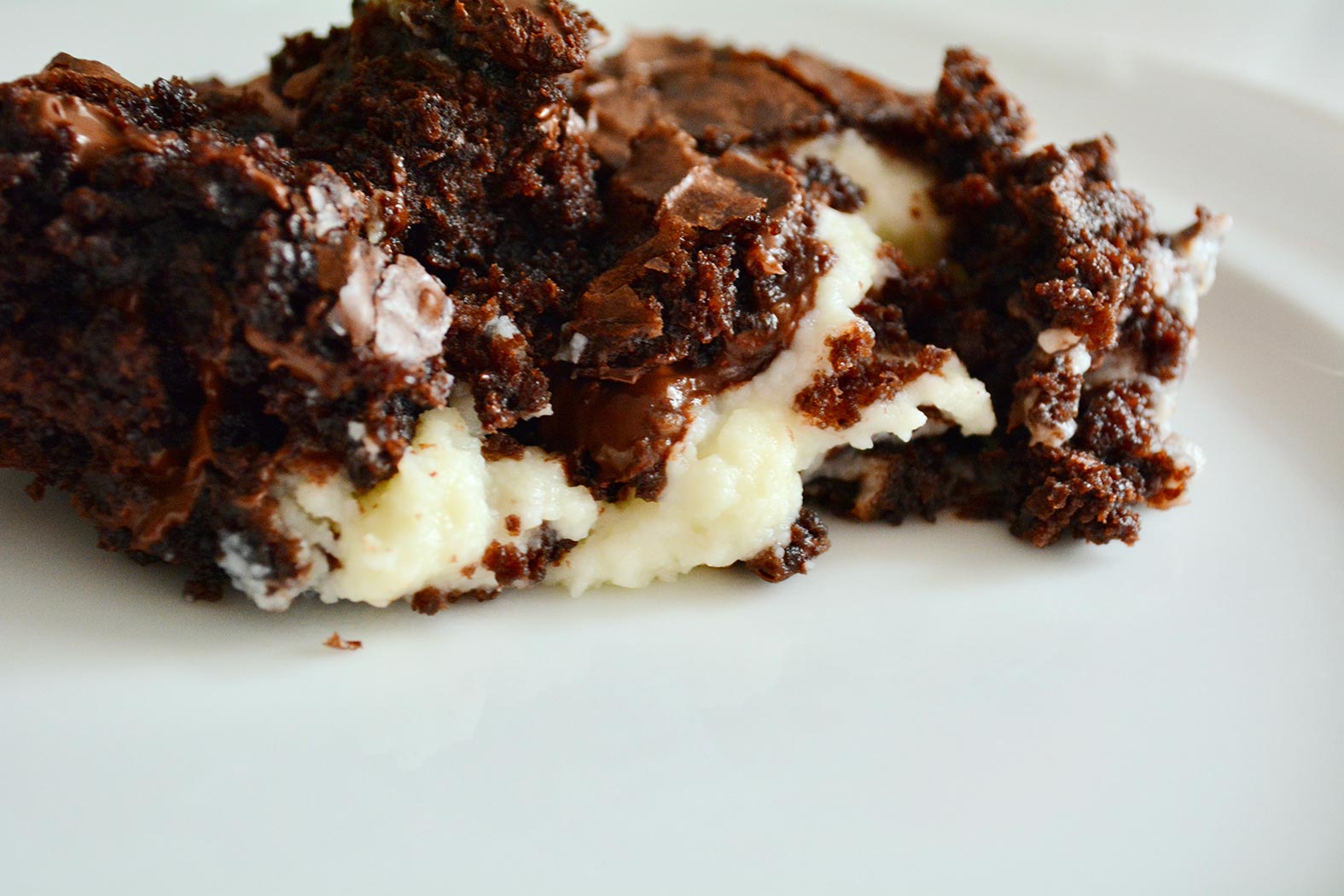 April 14, 2020 - Tuesday - I have thought a long time about what to do with the leftover filling I use in my Chocolate Pillows. I've thought to put a bit inside Chocolate Cupcakes, but when I went to the store there were no cake mixes at all. The only choice was brownies or fudge. I piped some in between layers of the brownie batter. It was delicious!