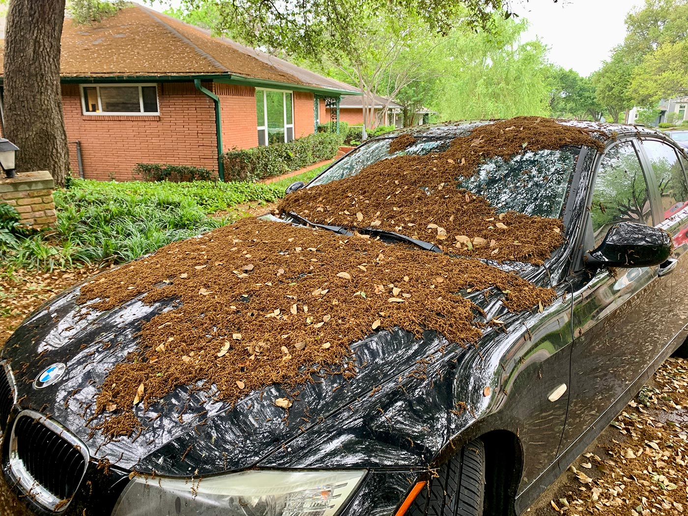 April 11, 2020 - Saturday - I have not driven my car since Thursday before last. I don't know what kind of trees these are but they're dropping tons of this stuff everywhere. It was sprinkling when I came out. I pulled most of this off and then drove around to the back and used a hose to rinse off the whole car. Went to do some much needed grocery shopping.