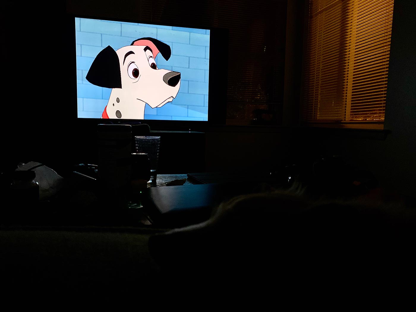 April 23, 2020 - Thursday - So Pancake almost doesn't watch TV at all anymore. Every once in a while she'll react to something on TV but rarely. I turned on 101 Dalmatians just to see if she'd react and I got almost nothing out of her the whole show. She slept on couch in front of me almost the whole time. My coffee table is pretty cluttered.