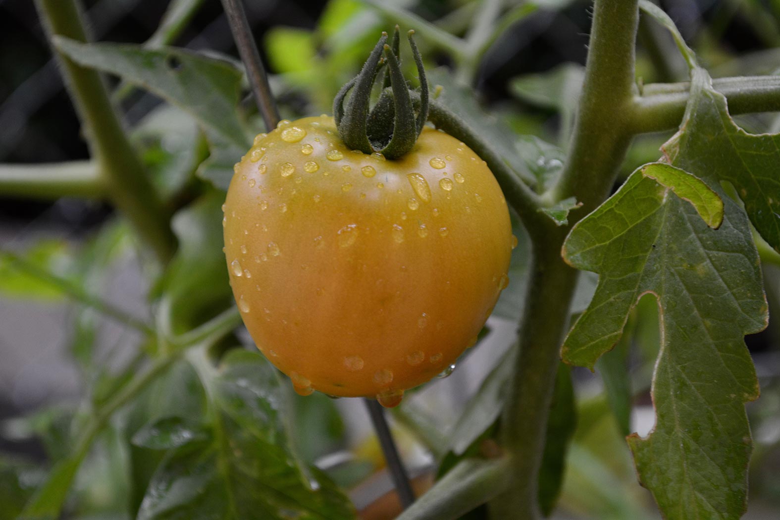 May 25, 2020 - Monday - It rained pretty much all day. This is my first tomato that is finally almost ripe after almost a month. It's about the size of a roma but round. I have about a dozen more of various sizes on the two plants in this pot. I have a couple more on another plant and a bunch of cherry tomatoes on plants in another pot.