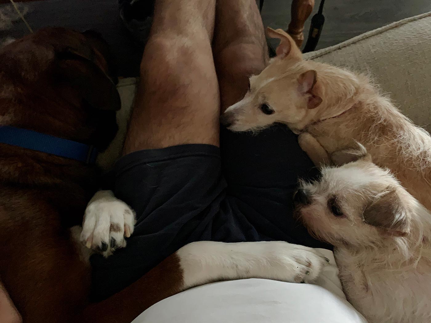 May 6, 2020 - Wednesday - This is the closest these three have gotten to each other in a very long while. Zak wants so much to be friends with them but they don't want to have anything to do with him. I was surprised that they both came up on the couch with Zak being just on the other side of me. See how close his leg is to them!