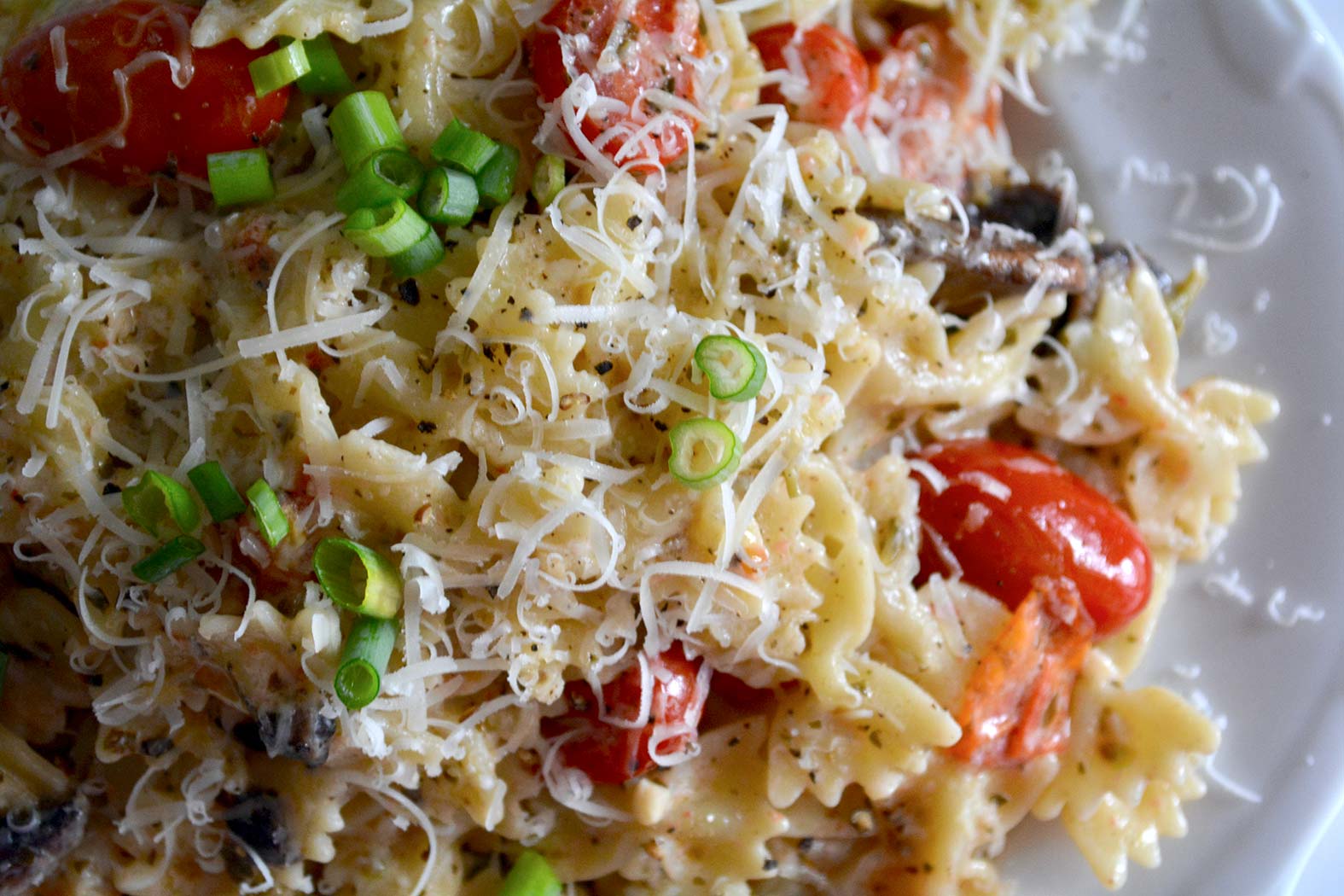March 30, 2021 - Tuesday - I've not made this in a while and I've not made this for lunch before. Today I got a little break around lunch and this really doesn't take very long to make. I had some mushrooms that I needed to cook so I added those to what is usually just a tomato and pesto dish.