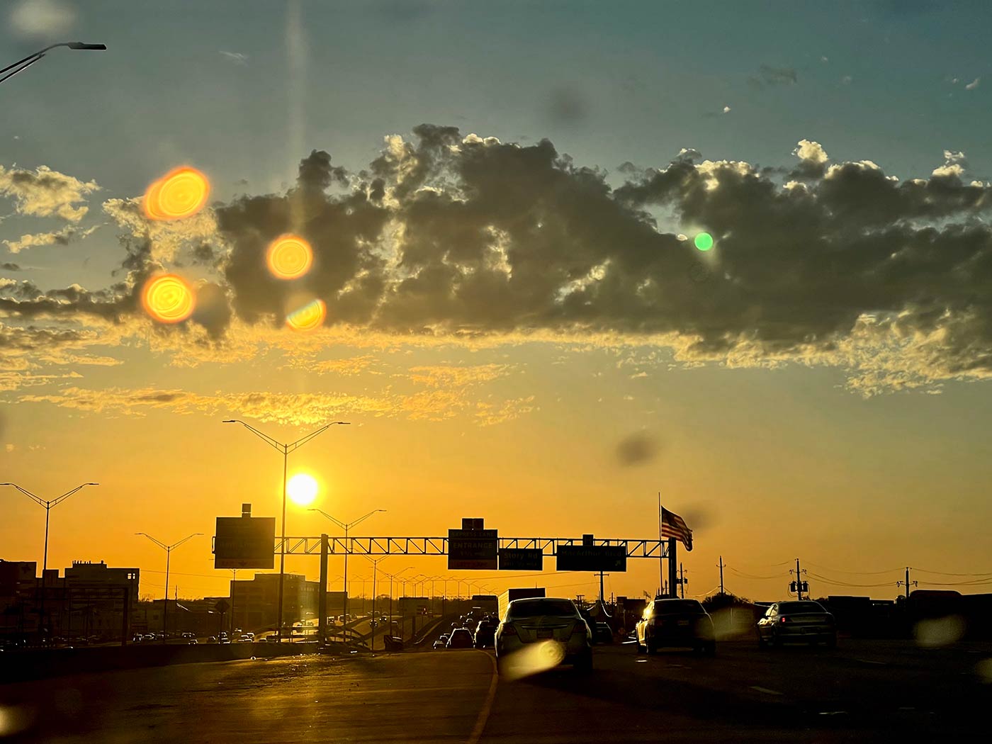 March 4, 2021 - Thursday - This evening after work I went out to see a friend I've not seen in a long while. It started to sprinkle just a little bit on the drive. I got this while traffic slowed down a little. I like the bright spots from where the drops on the windshield caught the sun.