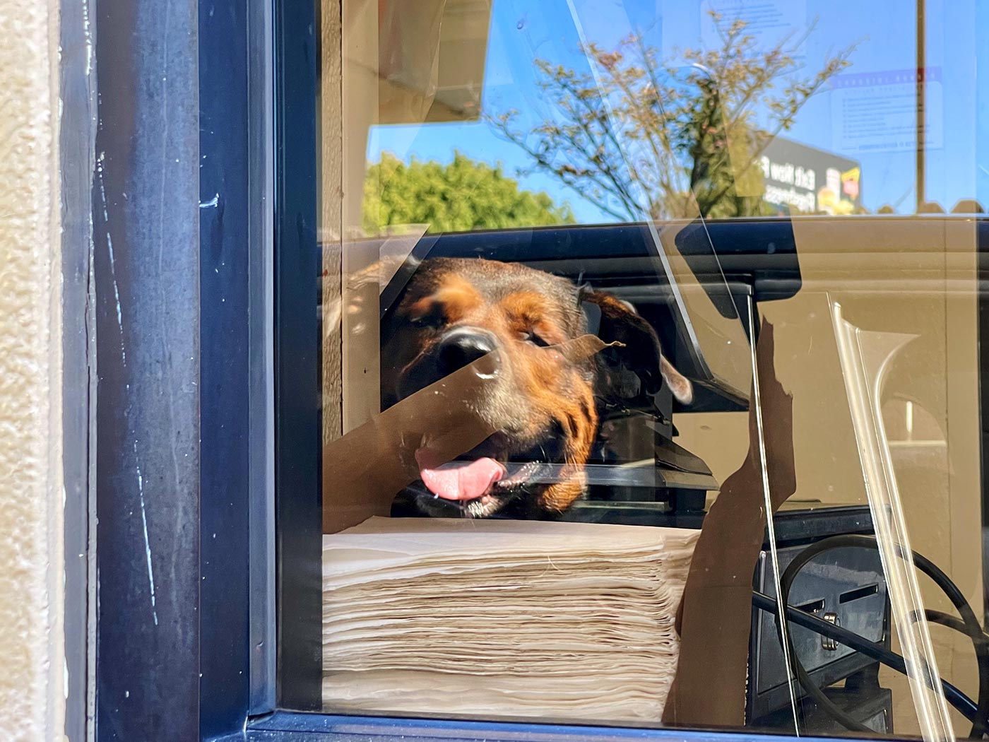 October 18, 2021 - Monday - Today I got out to run an errand at lunch. The weather's getting cooler and it's been a while since he's been for a ride so I took Zak with me. He talked me into stopping to get him and the girls some Whataburger. He's thoughtful like that. He looks kinda high. Maybe he has the munchies.