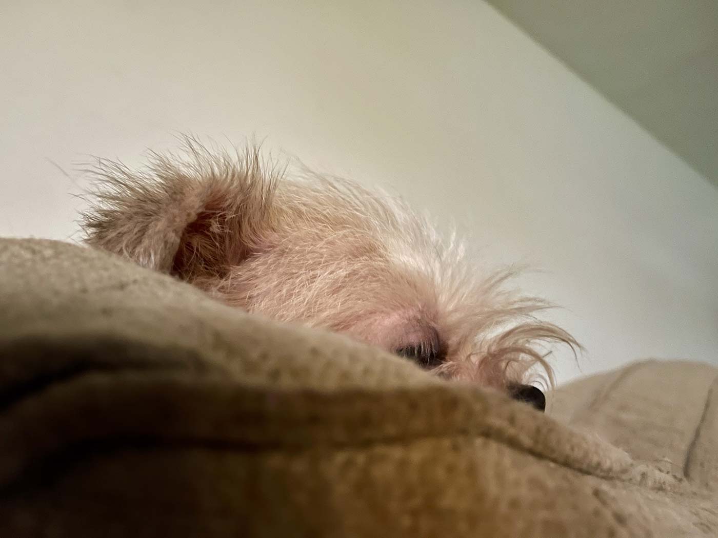 October 12, 2021 - Tuesday - Tonight I was relaxing on the couch with Zak. Pancake knows all she has to do is hop up near me and stare at Zak and he will move away. Once he left she curled up in my lap and went to sleep. I don't think I've ever had a wiry, scruffy dog like Pancake. She can be such a sweetheart.