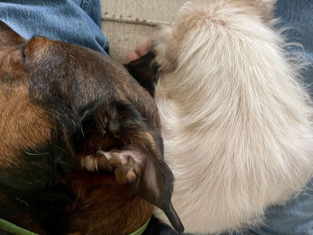 April 4, 2022 - Monday - Today I didn't do too much outside of returning all my work equipment back to the office. I spent some time on the couch this evening and it always makes me happy when Biscuit and Zak lay down next to each other. Still waiting on Pancake to warm up to Zak.