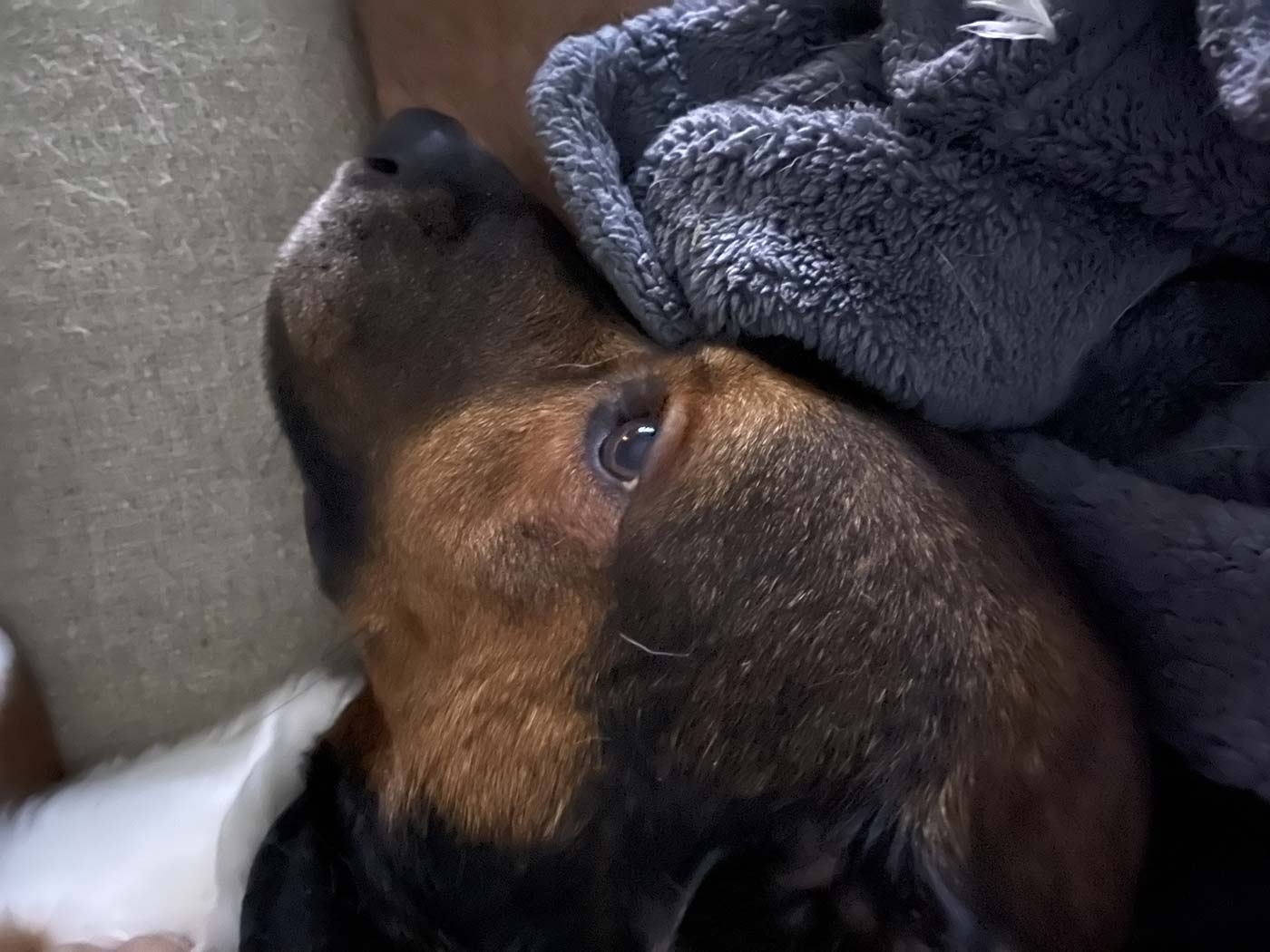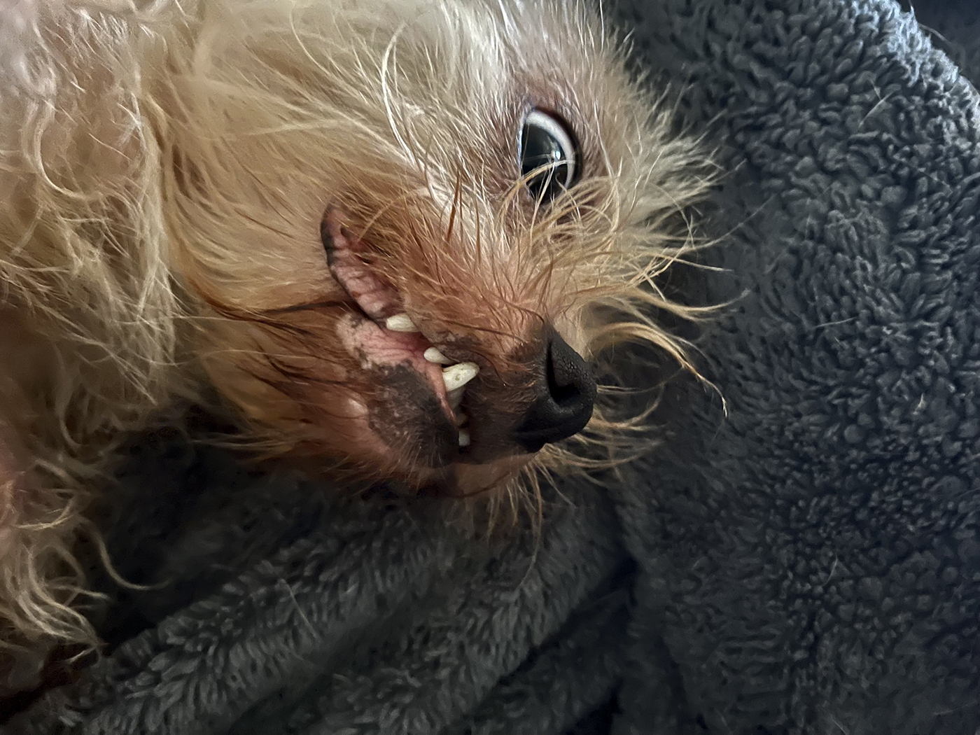 April 26, 2022 - Tuesday - Biscuit was on the couch rolling around on her back near me today. I don't know why her eyes look all crazy when she's on her back but I thought I'd get a picture of it. If she rolls over enough her lips flap open and you can see how crazy her teeth make her look too.
