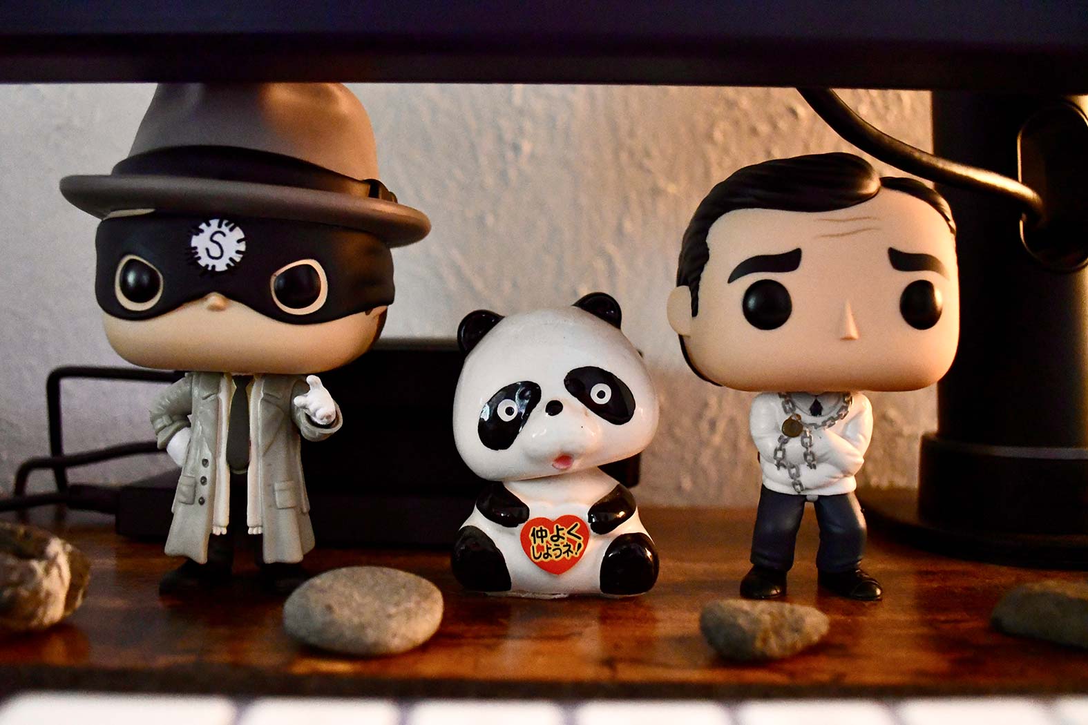 April 28, 2022 - Thursday - I was working a little late this evening and realized I hadn't take a photo today. My camera was here on my desk and so I took this. Riley gave me these two guys from The Office and the little panda came all the way from China from a friend who went to pet them.
