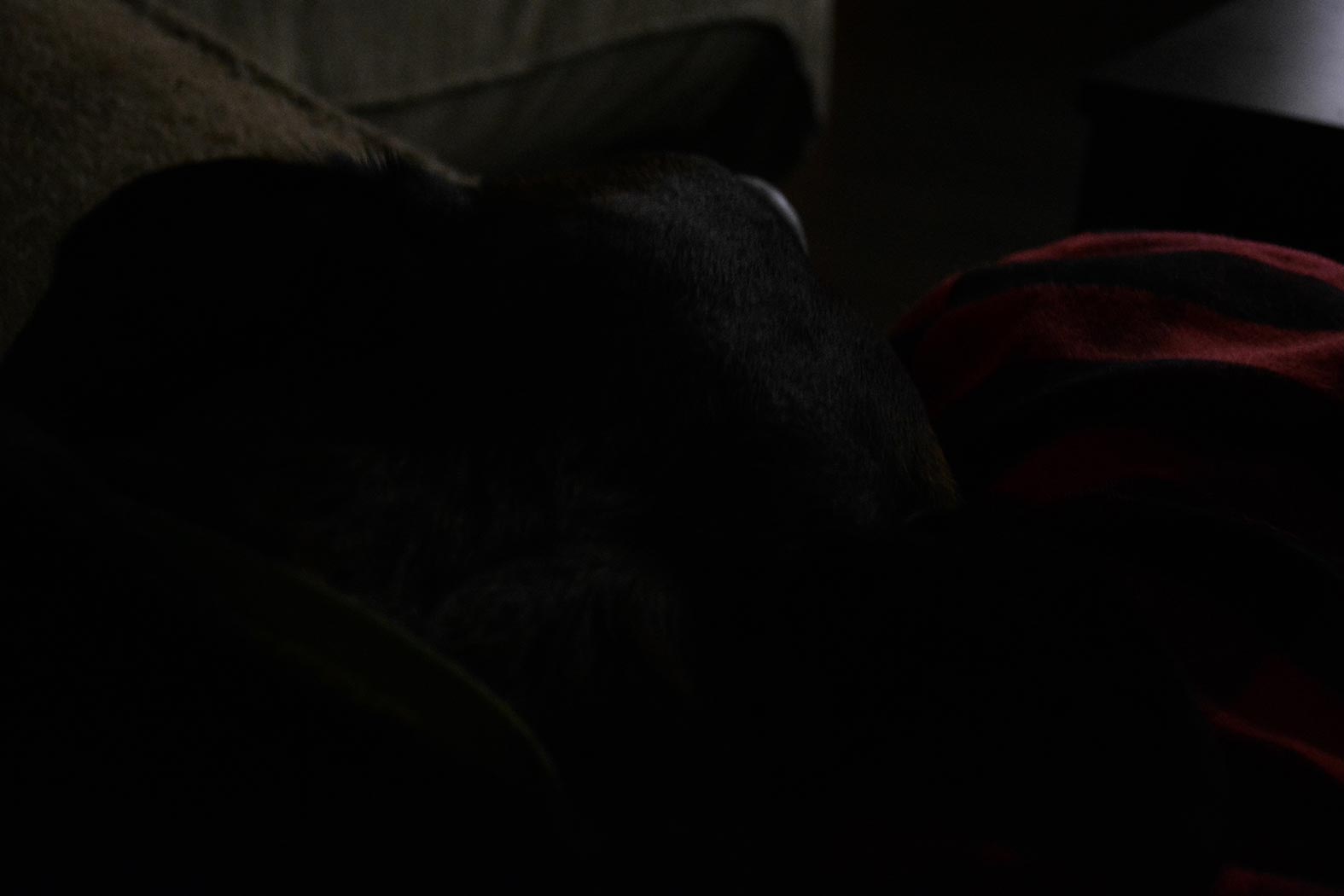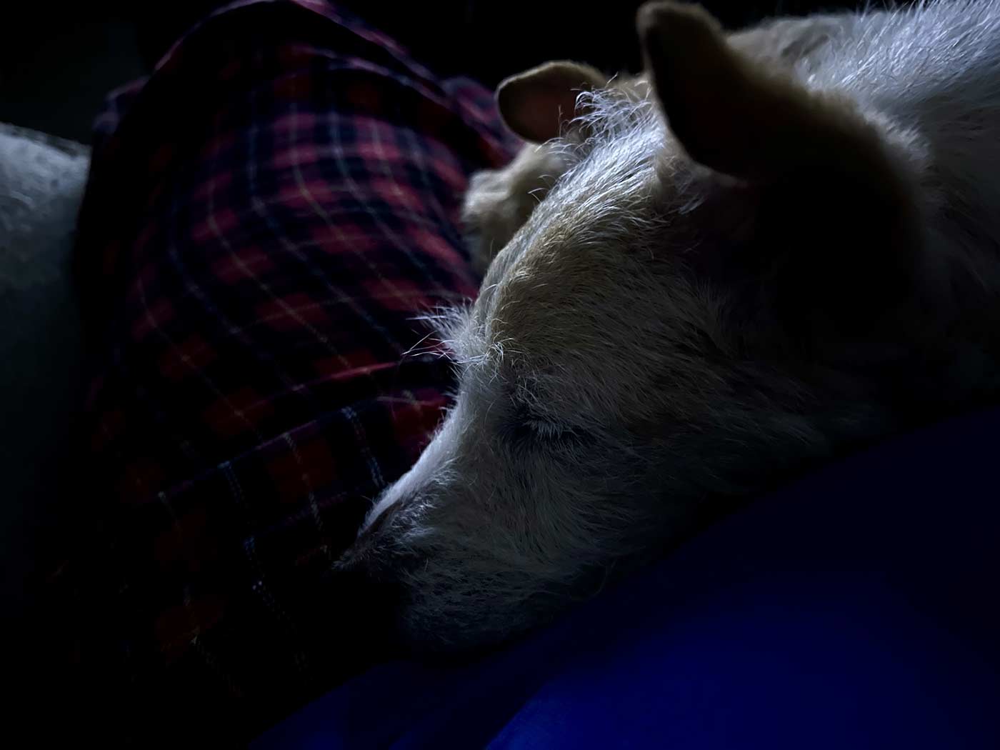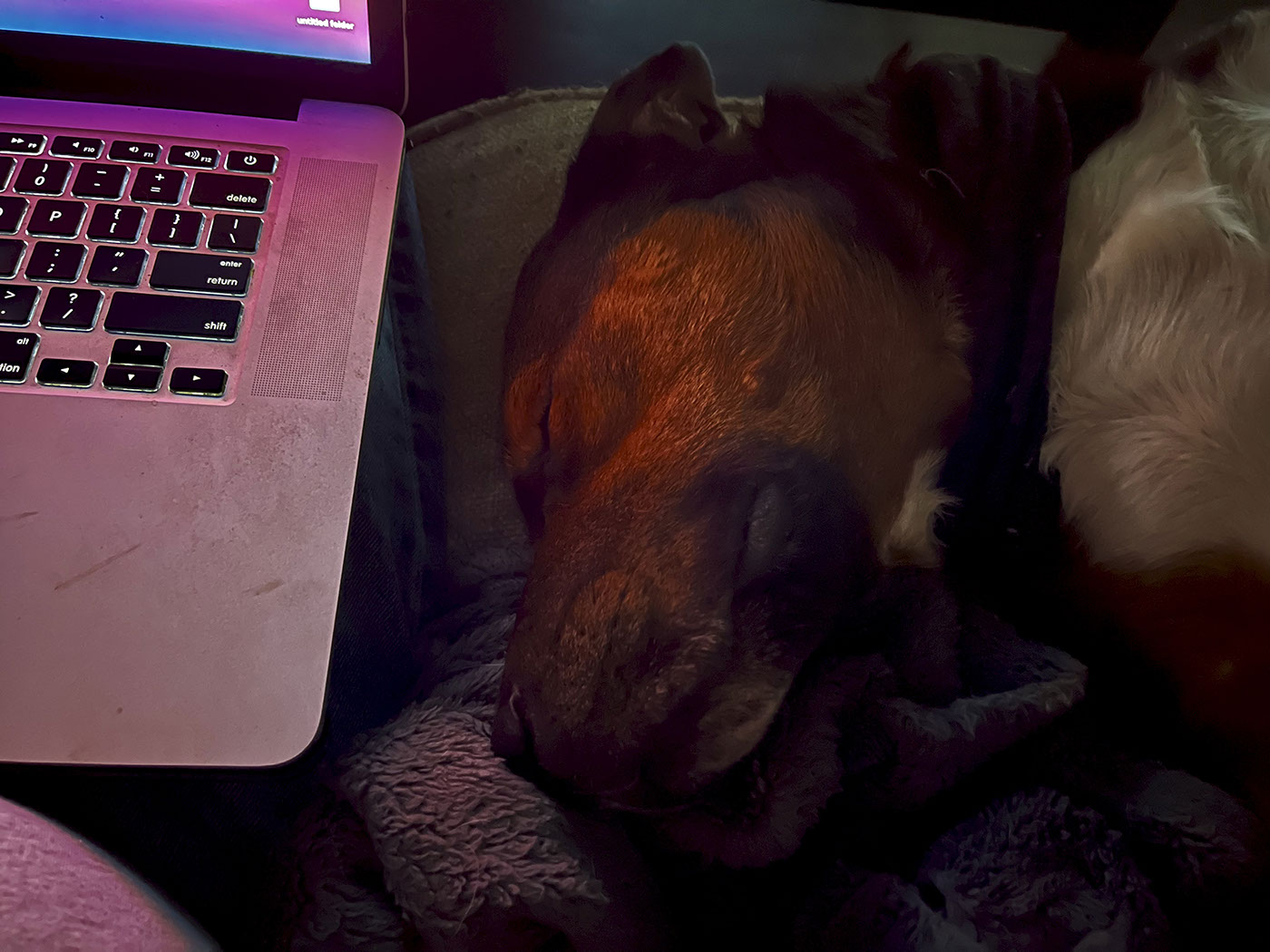 January 26, 2022 - Wednesday - I had some work to do this evening. Zak came up to keep me company. One of the perks of having a large dog is he makes a great armrest and he's pretty warm. One of the downsides is he puts his face on my laptop and it gets a little messy. I swear it didn't look this way in person.