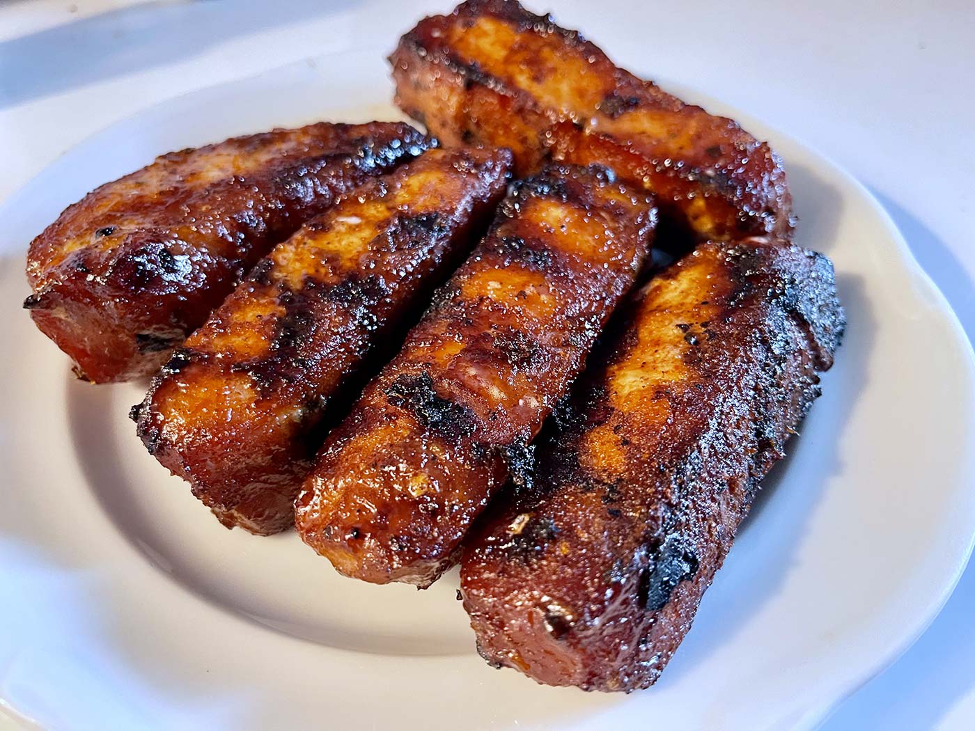 May 10, 2022 - Tuesday - I bought some boneless pork ribs the other day to make these. I've not made them in forever. They were my photo of the day back in 2012. A bit of blackening seasoning and brown sugar is all it takes to make these come off the grill a little sticky and a little spicy. Riley even liked them!